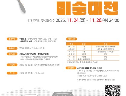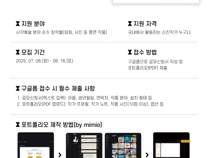 ■ 공모부문: 평면 회화작품 (서양화, 한국화) 10 ~ 15호 이내■ 공모대상: 만 34세 미만의 청년(신진)작가■ 공모기간: 2025년 8월 25일(월) ~ 10월 05일(일)■ 출품방…