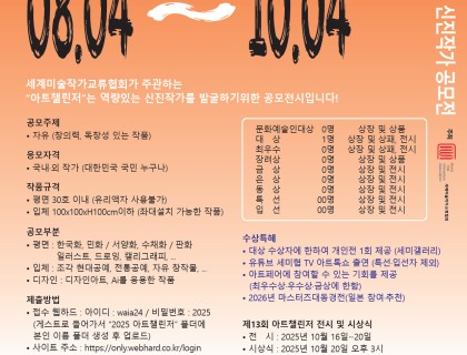 2025 13th Art Challenger 아트챌린저 13주년 -일정 • 2025 8월12일~10월4일 -공모주제 •자유 (창의력, 독창성 있는 작품)-공모주제 •자유 (창의력, 독창성 있는 작품)-응모자격 •국내외 작가 (대한민국 국민 누구나)-…