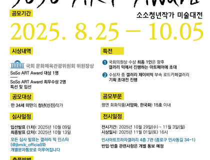 사단법인 국제청년예술가협회와 Gallery We가 ‘2025 YOUNG ARTIST CONTEST’ 를 개최합니다. 역량 있는 젊은 아티스트들의 활동을 지원하기 위한 ‘YOUNG ARTIST CONTEST’는 사단법인 국제청년예술가협회 주최, Gall…