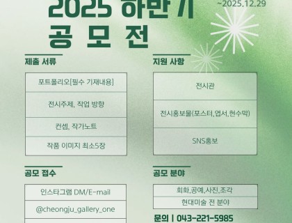 GALLERY ONE 청주점2025 하반기 전시 공모 안내■ 개 요대 상 : 전연령공모분야 : 회화 공예 사진 조각 등 현대미술 전 분야전시공모기간 : 2025년 12월 22일~2025년 12월 29일(최소 1주)접수마감 : 선정 완료 시 조기 …