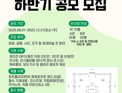 GALLERY ONE 청주점2025 하반기 전시 공모 안내7월, 청주점 오픈 예정■ 개 요대 상 : 전연령공모분야 : 회화 공예 사진 조각 등 현대미술 전 분야전시공모기간 : 2025년 8월 01일~2025년 12월 31일(최소 1주)접수마감 : …