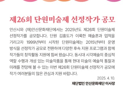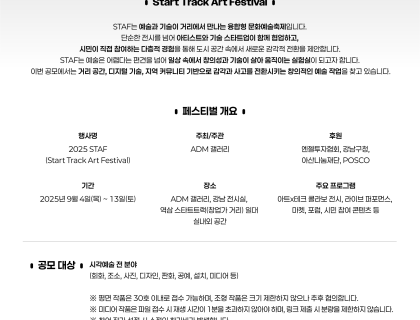 2025 청계천 공공미술 프로젝트 신진작가 작품공모서울시는 도시예술의 새로운 흐름을 이끌 공공미술 유망작가를 발굴하고,공공미술 작품 제작 및 전시를 통한 시민 문화 향유 기회 확대를 위해 공공미술 신진작가를 대상으로 하는 작품공모를 개최합니다. “크…