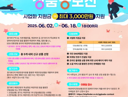 ● 공모 주제 경기바다의 섬, 어촌체험마을, 해양레저 등 경기바다의 특성화된 해양레저관광자원 등을 활용한 해양레저 체험, 힐링 웰니스, ESG,친환경형 분야의 해양레저관광상품을 공모합니다. *경기바다 : 경기도 권역(화성,평택,시…