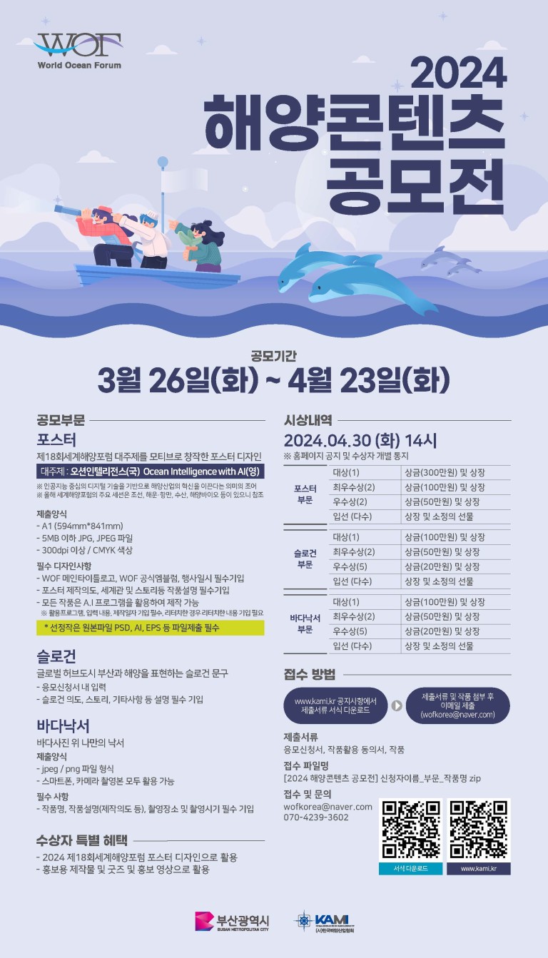 부산광역시와 (사)한국해양산업협회가 해양산업에 대한 관심과 해양문화 창달에 기여하기 위하여 <2024 해양콘텐츠공모전>을 개최합니다.