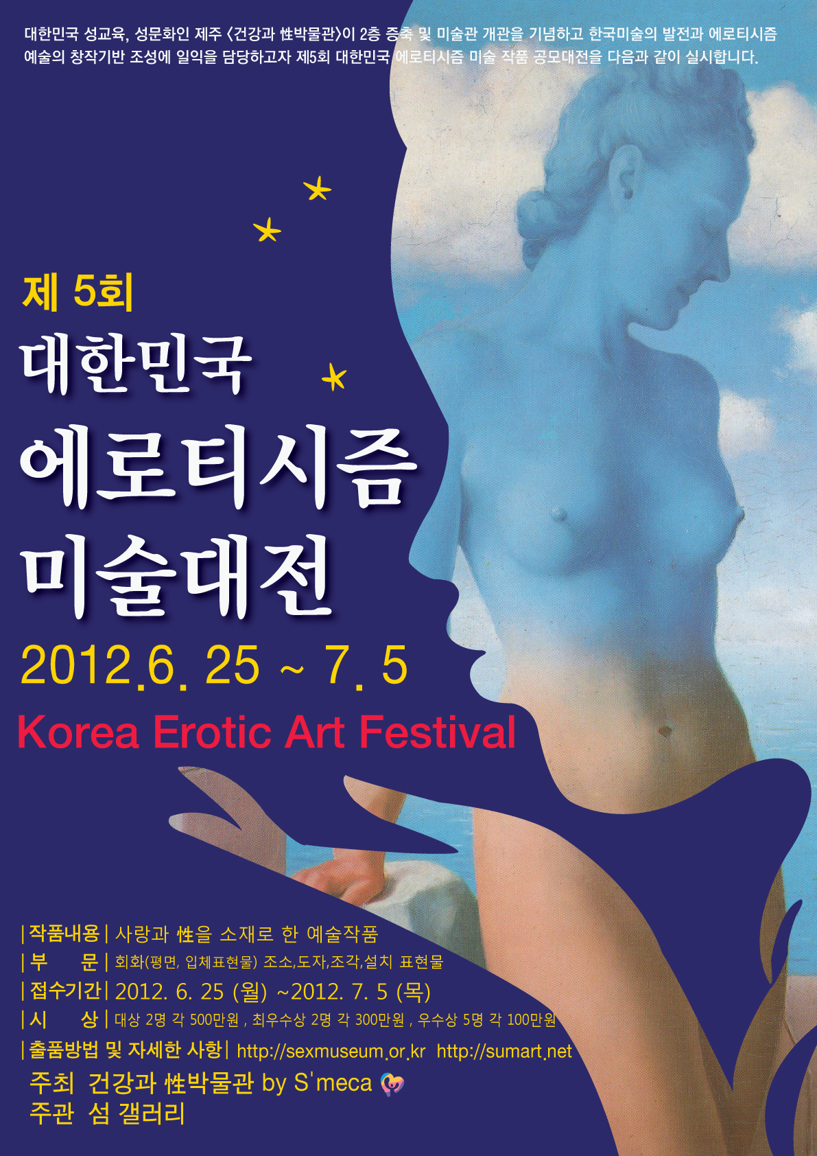 대한민국 성교육, 성문화의 메카인 제주 <건강과 性박물관>이 2층 증축 및 미술관 개관을 기념하고 한국미술의 발전과 에로티시즘 예술의 창작기반 조성에 일익을 담당하고자 제5회 대한민국 에로티시즘 미술 작품 공모대전을 다음과 같이 실시합니다.
