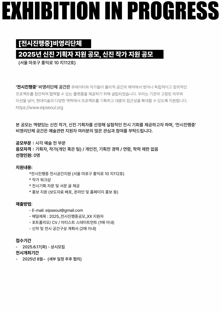 * 역량있는 신진 작가, 신진 기획자를 선정해 실험적인 전시 기회를 제공하고자 하며, ‘전시진행중’ 비영리단체 공간은 예술관련 지원자 여러분의 많은 관심과 참여를 부탁드립니다.