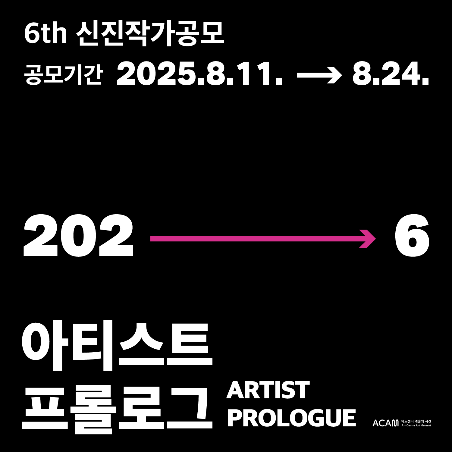 아트센터 예술의 시간은 2026년 상반기 개최하는 연례전시 〈아티스트 프롤로그 2026〉에 참여할 작가를 공모합니다. 최종 선정된 3인(팀)의 작가는 2026년 3월에서 8월까지, 순차적으로 개인전을 개최하게 됩니다. 개인전이 열리는 공간은 아트센터 예술의 시간 4층 전시공간입니다. 예술의 시간만의 내러티브와 시간의 흔적이 깃든 공간을 재해석하는 독창적인 전시 기획과 신진 작가를 기다립니다. 많은 관심과 지원 바랍니다.