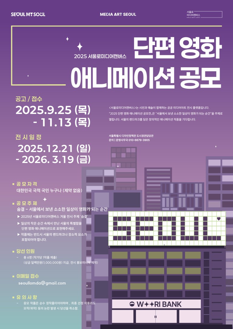 서울의 일상을 영화 같은 시선으로 담아낼 창의적인 작품을 기다립니다. 예술가 여러분의 많은 관심과 참여를 바랍니다.