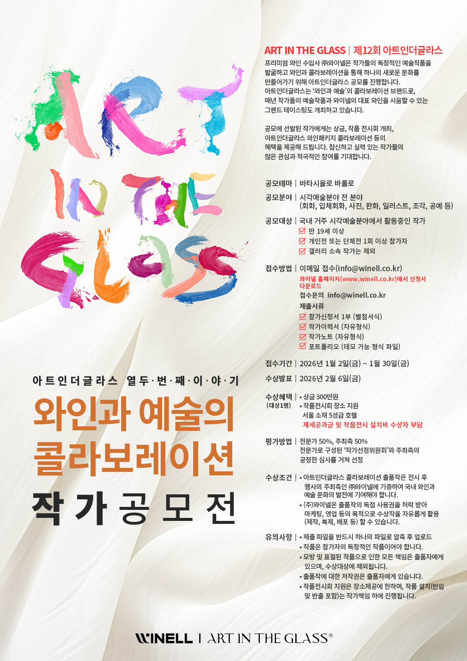 프리미엄 와인 수입사 (주)와이넬은 작가들의 독창적인 예술작품을 발굴하고 와인과 콜라보레이션을 통해 하나의 새로운 문화를 만들어가기 위해 '아트인더글라스 공모'를 진행합니다.