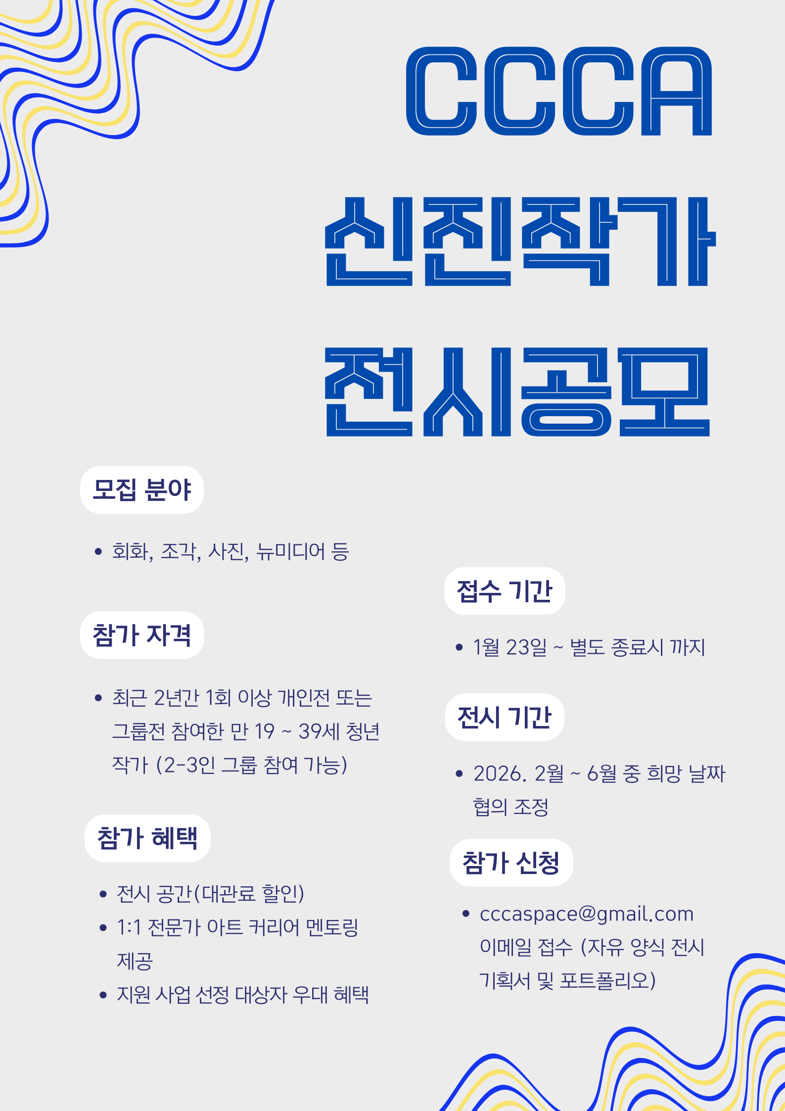 제출방식 : cccaspace@gmail.com 이메일 접수 (자유 양식 전시 기획서 및 포트폴리오 제출)
