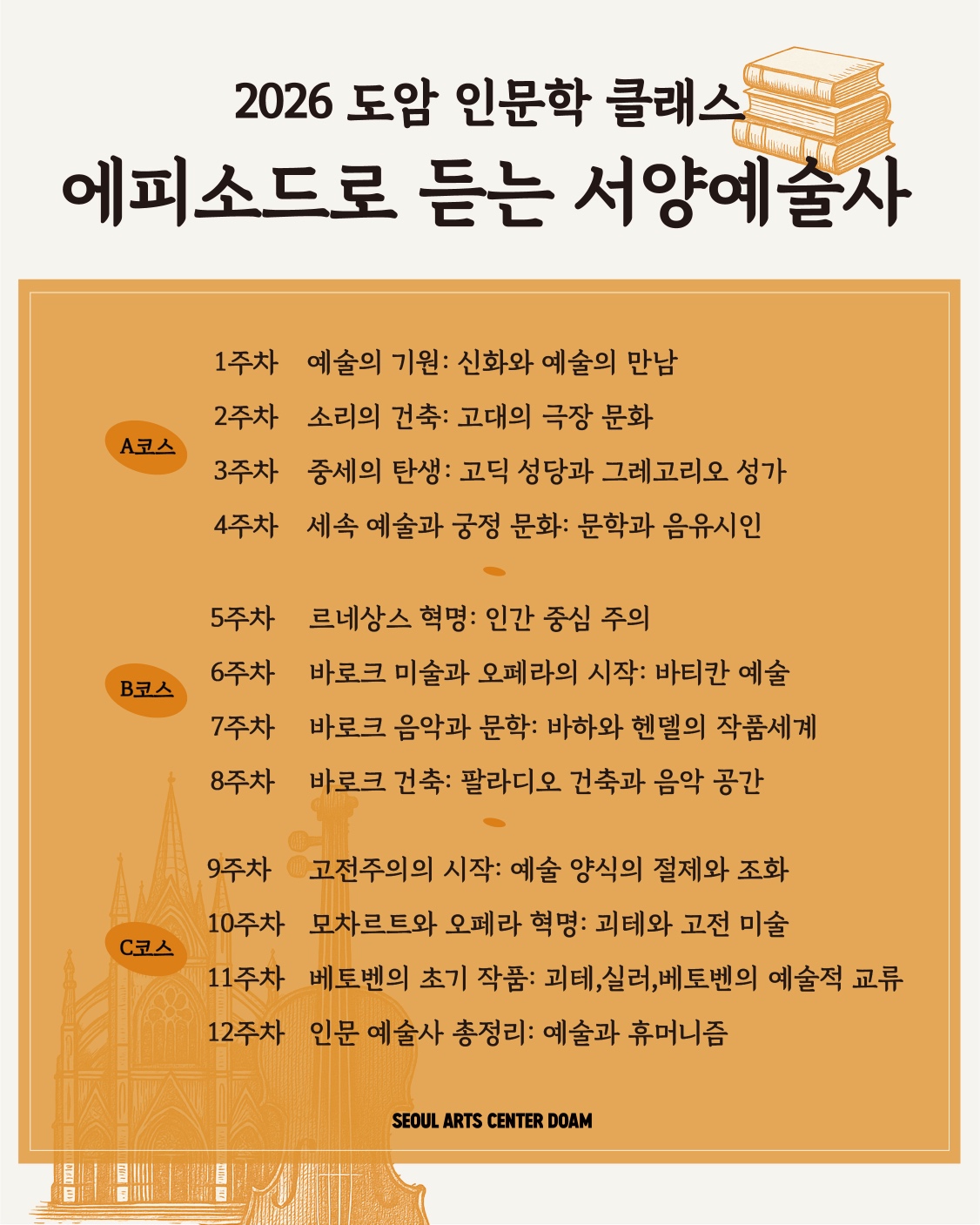 음악, 건축, 미술 등 예술의 전 장르를 아우르는 에피소드를 통해 서양예술사를 입체적으로 이해하는 인문학 입문 강좌
