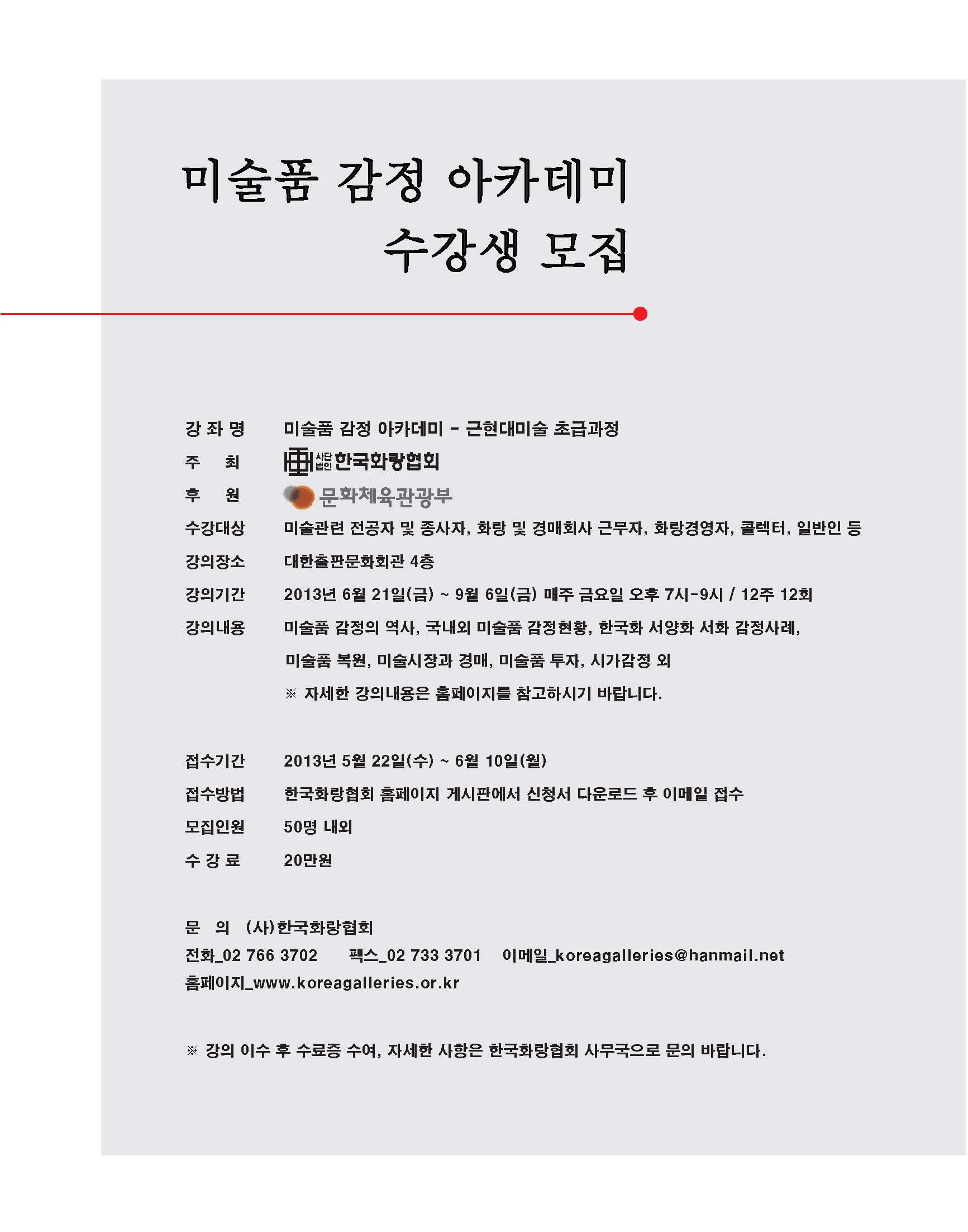 [한국화랑협회] 미술품 감정 아카데미 수강생 모집 페이지 정보 작성자 한국화랑협회 조회 18,905회 작성일 13-06-03 14:57 본문 추천 0 목록 이전글 [고양문화재단] HERITAGE600 TOMORROW600 : 돌아보다 바라보다 展 13.06.10 다음글 (사)부산비엔날레조직위원회 제8대 운영위원장 추천 안내 13.05.29