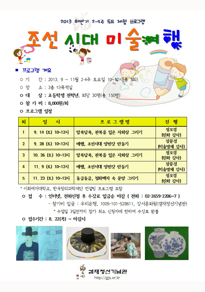 2,4주 토요체험프로그램_조선시대 미술여행 페이지 정보 작성자 장희선 조회 17,121회 작성일 13-08-20 14:26 본문 추천 0 목록 이전글 [겸재정선기념관] 제4회 겸재 내일의 작가 공모 안내 13.08.20 다음글 [느리게 읽는 미술책방] 자원활동가 모집공고 13.08.01 장희선님의 자유게시판 관련글 자유게시판 더보기 H 인기글 [겸재정선미술관] 2018. 제9회 겸재 내일의 작가 … 07-07 H 인기글 [겸재정선미술관] 2017. 겸재랑 즐거운 어린이날 대… 04-16 H 인기글 [겸재정선미술관] 제14회 겸재 전국 사생대회 04-16 H 인기글 [겸재정선미술관] 2017. 제8회 겸재 학술논문현상공… 12-27 H 인기글 [겸재정선미술관] 2017. 제8회 겸재 내일의 작가 … 12-27 H 인기글 [겸재정선미술관] 2017. 겸재 미술관 극장 안내 12-21 H 인기글 [겸재정선미술관] 2017. 겸재 함께 공부하기 강좌 … 12-21 H 인기글 [겸재정선미술관] 2017. 명사석학 미술 인문학 강좌… 12-21 H 인기글 [겸재정선미술관] 제2기 겸재 홍보 서포터즈 활동단 모… 12-06 H 인기글 [겸재정선미술관] 2017. 학술논문현상공모 안내 08-02