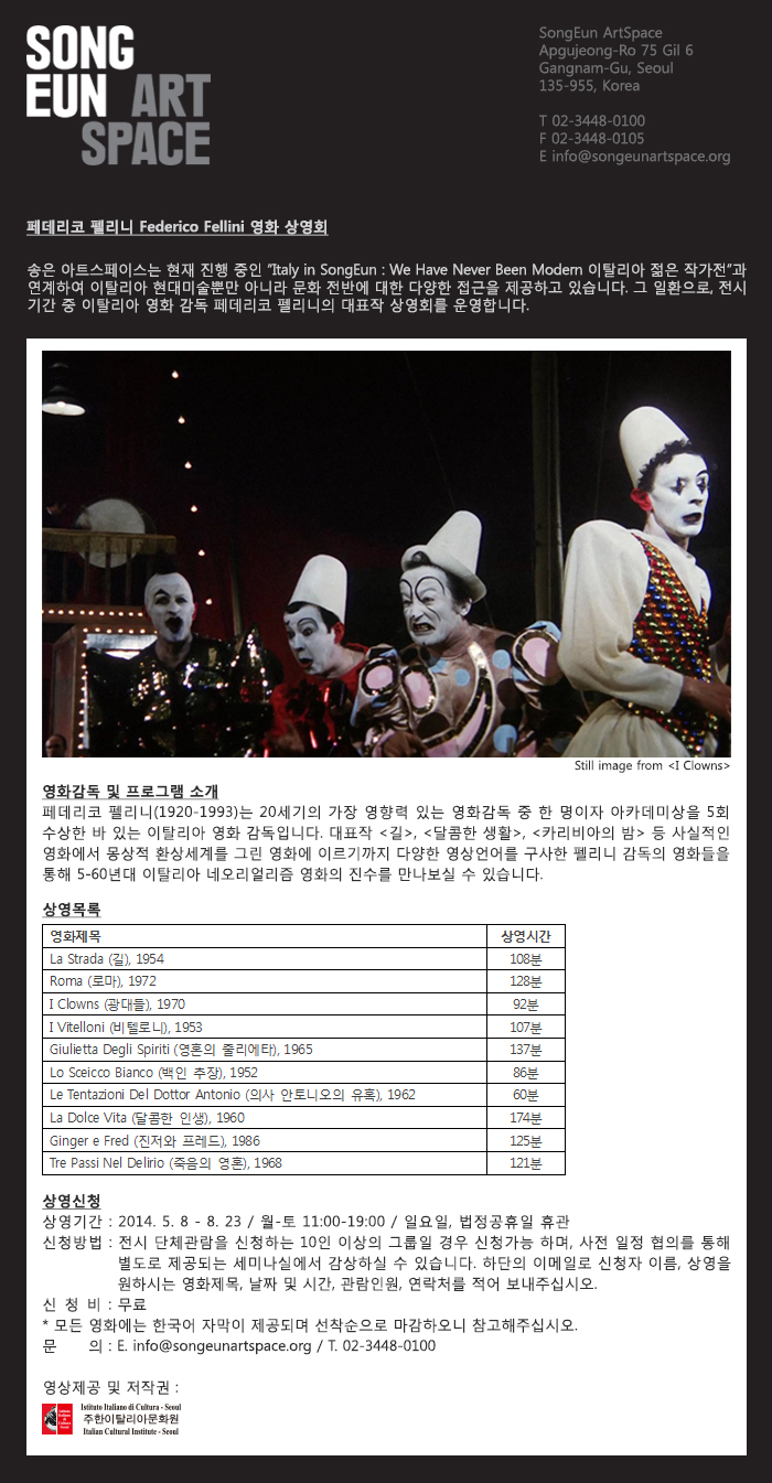 [송은아트스페이스] 페데리코 펠리니 영화 상영회 안내 페이지 정보 작성자 송은아트스페이스 조회 16,962회 작성일 14-07-05 17:54 본문 추천 0 목록 이전글 [2014 단원미술제 미술부문 작품공고] 14.07.15 다음글 공동체 기반 예술 워크숍 The Community-based Art Workshop 피어라 커뮤니티 14.07.04 송은아트스페이스님의 자유게시판 관련글 자유게시판 더보기 H 인기글 [송은 아트스페이스] “제18회 송은미술대상전” 단체관… 01-10 H 인기글 [송은 아트스페이스] 도슨트 자원봉사자 모집 ‘제17회… 11-21 H 인기글 [송은 아트큐브] 이병찬 개인전: 위장된 북어 9/15… 10-20 H 인기글 [송은 아트스페이스] 손동현: Jasmine Drago… 08-01 H 인기글 [송은 아트스페이스] 도슨트 자원봉사자 모집 “손동현:… 06-17 H 인기글 [송은 아트스페이스] 도슨트 자원봉사자 모집 “전소정 … 04-21 H 인기글 [송은 아트스페이스] 프랑스 지역자치단체 현대미술 컬렉… 03-22 H 인기글 [송은 아트스페이스] 도슨트 자원봉사자 모집 ‘What… 02-17 H 인기글 [송은 아트큐브] 류현민 개인전 : 완벽한 수평을 찾아… 12-10 H 인기글 [송은 아트스페이스] 톰 탄디오의 인도네시아 현대미술 … 10-12