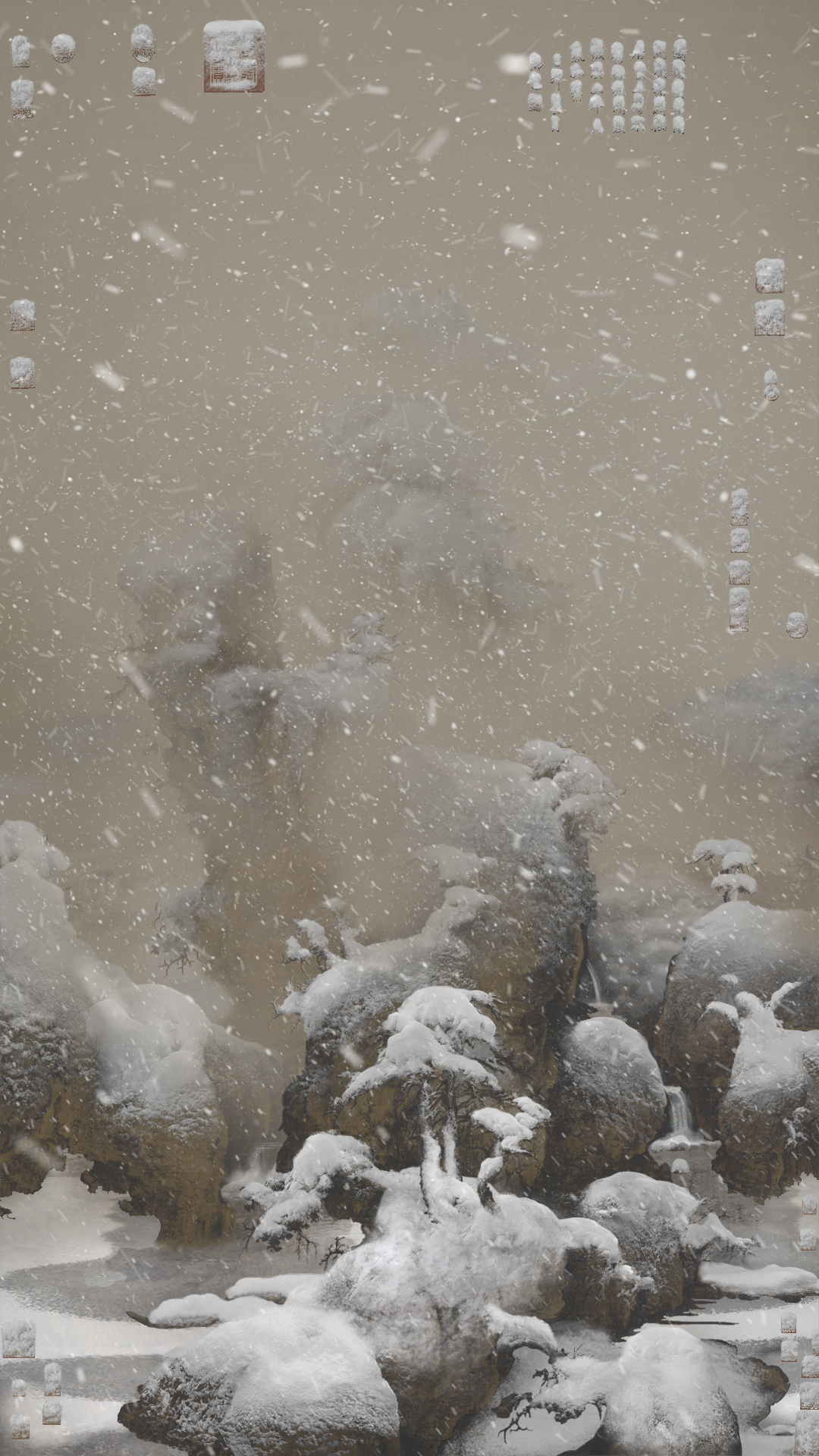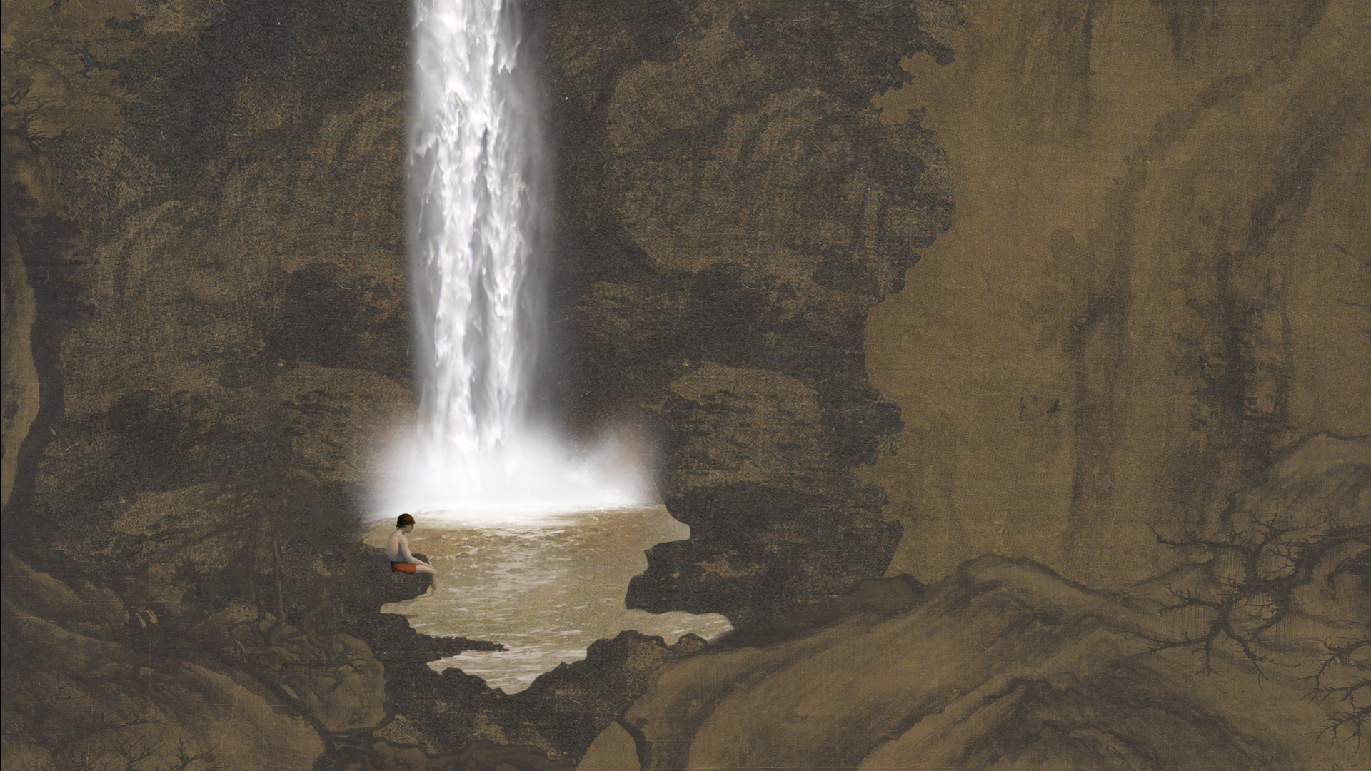 ▷ 이이남의 미디어 작품에는 동양과 서양, 고전과 현대, 디지털과 아날로그가 시공간을 초월하여 만나는 생생한 모습이 보여진다. 세월이 느껴지는 한지에 먹으로 그려진 작품 <조춘도- Invisible Light> 속에는 산수풍경 속 구불구불하게 자라난 소나무 가지에 메어진 그네를 타는 한 여인이 등장한다. 스캔들적 요소로도 유명한 장 오노레 프라고나르의 <그네(1767)>에서 따온 장면이다. 그 뒤 바위 사이로는 밀레의 <이삭 줍는 사람들(1857)>도 보인다. 카스파르 다비드 프리드리히의 <안개 바다 위의 방랑자(1818)>가 안개 낀 동양의 나지막하고 고요한 산을 내려다보고 있는데, 멀리 맞은 편 산에는 모네의 <우산 쓴 여인(1875)>이 희미하게 드러난다. 쇠라의 그림 속 <아스니에르에서의 물놀이(1883-1884)>를 즐기던 소년은 조춘도 폭포 아래에 앉아 조용히 물에 발을 담근다. 전혀 다른 시대의 기법과 색채, 사고가 한데 섞여 서로 충돌할 법도 하지만 흥미롭게 어우러지며 기존의 명작이 가지는 무게와 역사성을 벗어나 작품을 감상하게 하며 관람자의 상상력을 자극한다.