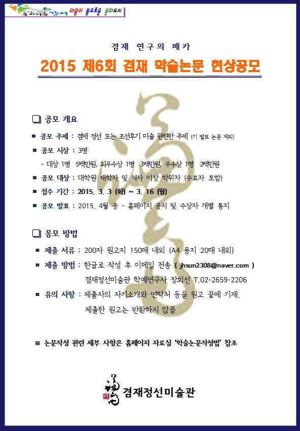 겸재정선미술관 2015년 제6회 겸재학술논문현상공모전 안내 페이지 정보 작성자 장희선 조회 19,457회 작성일 14-12-12 15:40 본문 많은 참여 바랍니다. 추천 0 목록 이전글 소울아트스페이스 개관9주년 < Memories of Nature >展 14.12.17 다음글 서울옥션 <ART&AUCTION> 대학생 아카데미 14.12.11 장희선님의 자유게시판 관련글 자유게시판 더보기 H 인기글 [겸재정선미술관] 2018. 제9회 겸재 내일의 작가 … 07-07 H 인기글 [겸재정선미술관] 2017. 겸재랑 즐거운 어린이날 대… 04-16 H 인기글 [겸재정선미술관] 제14회 겸재 전국 사생대회 04-16 H 인기글 [겸재정선미술관] 2017. 제8회 겸재 학술논문현상공… 12-27 H 인기글 [겸재정선미술관] 2017. 제8회 겸재 내일의 작가 … 12-27 H 인기글 [겸재정선미술관] 2017. 겸재 미술관 극장 안내 12-21 H 인기글 [겸재정선미술관] 2017. 겸재 함께 공부하기 강좌 … 12-21 H 인기글 [겸재정선미술관] 2017. 명사석학 미술 인문학 강좌… 12-21 H 인기글 [겸재정선미술관] 제2기 겸재 홍보 서포터즈 활동단 모… 12-06 H 인기글 [겸재정선미술관] 2017. 학술논문현상공모 안내 08-02
