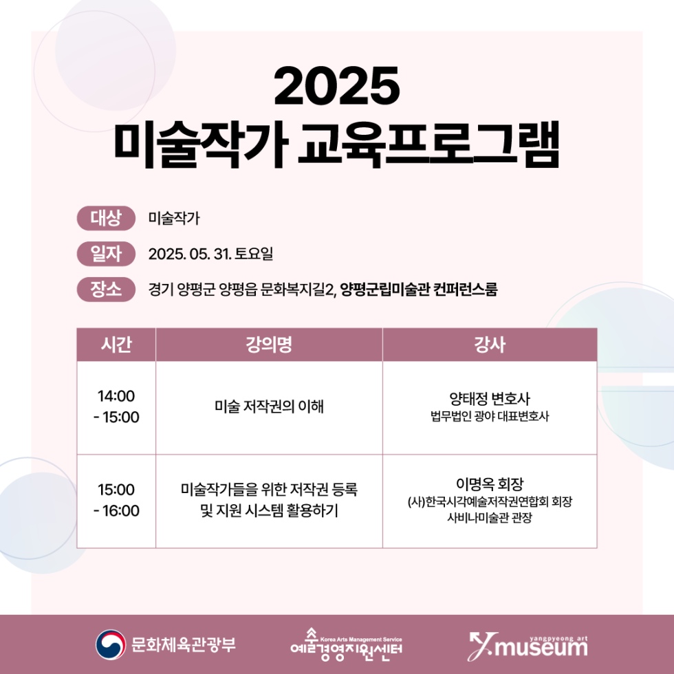 양평군립미술관 <2025 미술전업작가를 위한 미술분야 저작권 교육>(05.31.)