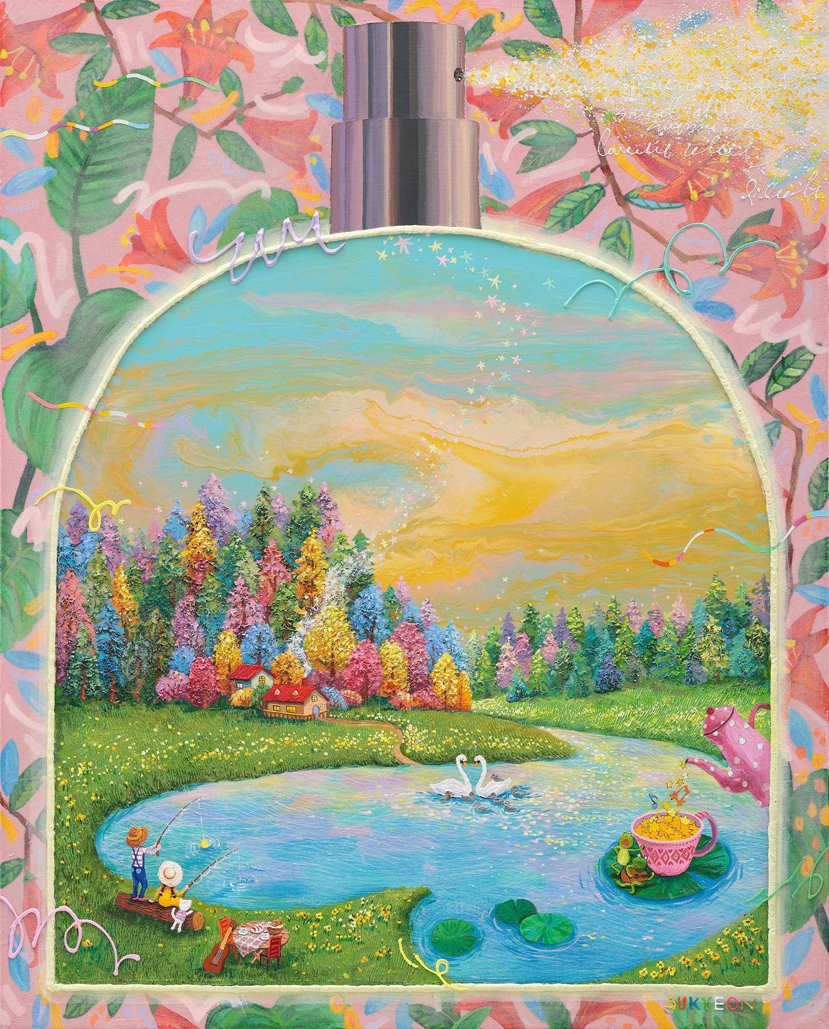 누구나 각자의 방식으로 기억을 남기고, 또 누군가와 나누고 싶어합니다. 저는 회화라는 매체를 통해 제가 느꼈던 행복한 순간들을 그림으로 담아내고, 많은 분들과 그 감정을 나누고자 합니다. 일상이나 여행 속에서 마주친 평화롭고 설레는 순간들— 예를 들면, 탁 트인 사과밭 풍경, 레몬빛 아침 햇살이 비추는 지중해의 해변, 자연 속의 여유로운 시간들—이런 기억들은 제게 특별한 향기와 감정으로 남아 있습니다. 저는 그런 감각을 색과 형태로 표현하여 캔버스에 옮기고, 누구나 공감할 수 있는 따뜻한 이미지로 전하고 싶습니다. 행복의 모습은 사람마다 다르지만, 행복을 바라는 마음은 모두에게 공통된 것 이라 생각합니다. 제 그림에는 그런 마음이 담겨 있습니다. 밝고 경쾌한 색감, 또렷한 선으로 표현된 동화 같은 장면들은 생생하고 따뜻한 느낌을 주며, 보는 분들이 자신의 기억과 감정을 자연스럽게 떠올릴 수 있도록 도와줍니다. 요즘에는‘풍경의 향기를 담은 향수병을 중심으로 작업하고 있습니다. 사람은 다섯 가지 감각 중에서도 특히 후각을 오래 기억한다고 합니다. 향기는 감정과 추억을 깊이 연결해 주는 감각이기 때문에, 어떤 냄새를 맡으면 오래전의 순간 이 선명하게 떠오르기도 합니다. 저는 그림을 통해 이런 ‘감각의 기억을 시각화하고자 했습니다. 아름다웠던 풍경과 그 속에서 느꼈던 감정, 그리고 그 순간의 향기를 색채와 형태로 표현 하고, 그것을 상징적으로 향수병에 담아내고 있습니다. 제 그림을 보는 분들도 각자의 기억 속 향기와 감정을 떠올리며, 함께 따뜻한 추억을 나눌 수 있기를 바랍니다.