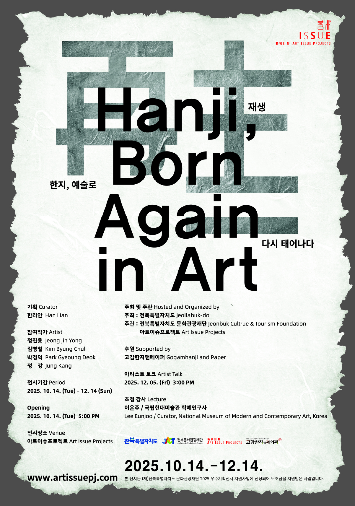 □ 전북특별자치도문화관광재단 ‘우수기획전시 지원사업’에 선정된 아트이슈프로젝트 기획전 ‘재생 再生: 한지, 예술로 다시 태어나다’를 10월 14일부터 12월 14일까지 전주 아트이슈프로젝트에서 선보인다.
