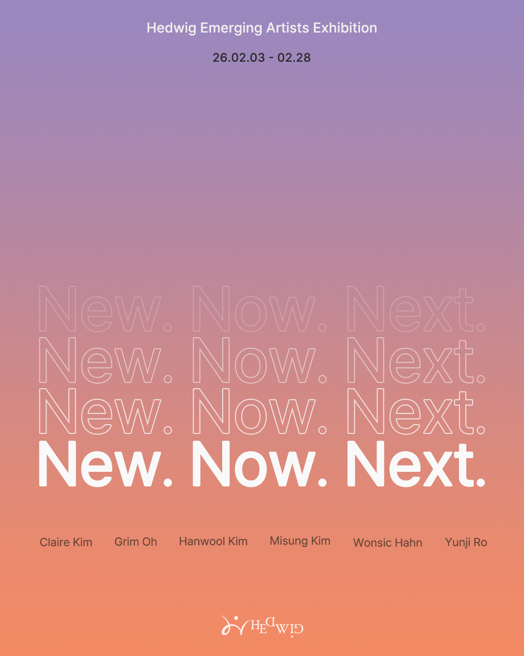 《New. Now. Next.》는 동시대 시각예술의 흐름 속에서 새로운 가능성과 감각을 드러내는 신진 작가 6인을 조명하는 전시다. 이번 전시는 2026년 헤드비갤러리 신진 작가 공모를 통해 선정된 김미성, 김선경, 김한울, 노연지, 오그림, 한원식 작가의 작업을 중심으로 기획되었다.