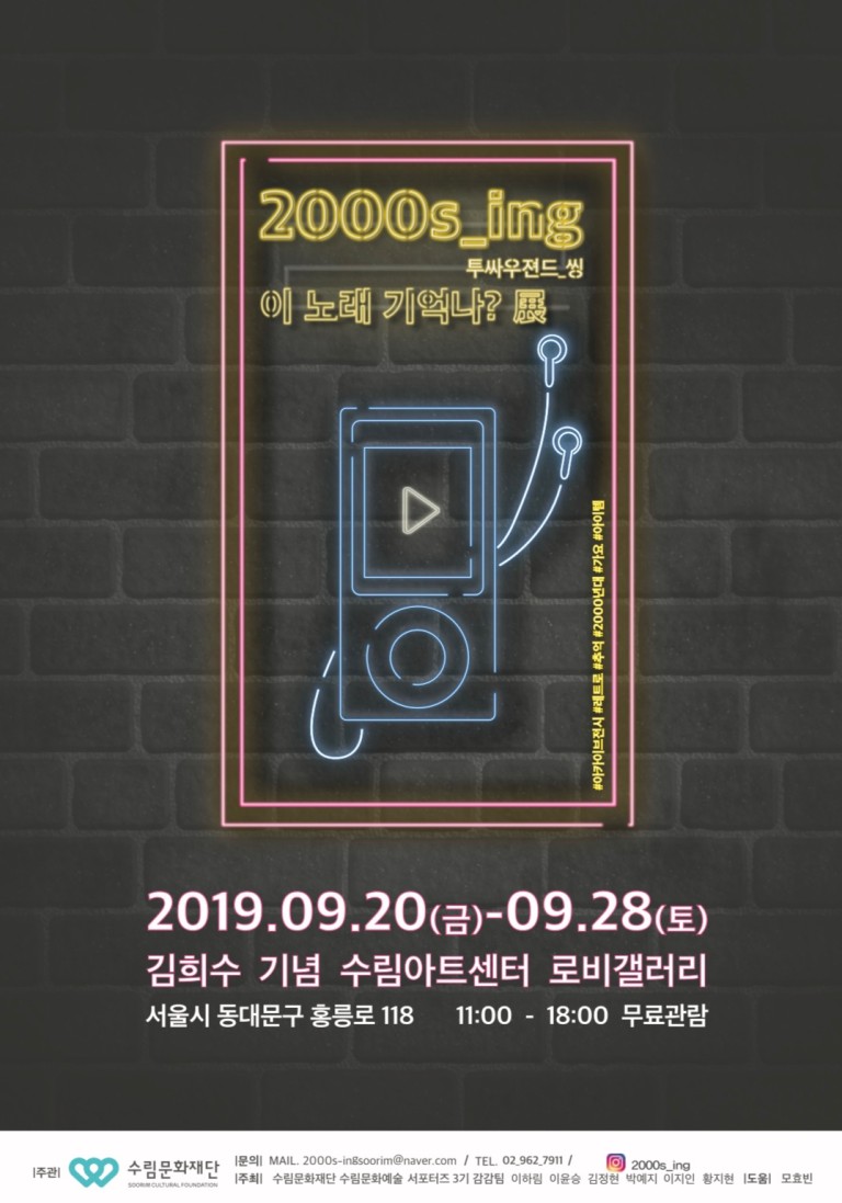 <2000s_ing: 이 노래 기억나?> 는 지금 20대가 어린이, 청소년이었던 시절의 음악과 함께 과거의 아이템들을 선보임으로써 향수를 자극하고 현대 사회에서 느껴지는 속도감의 불안 대신 친숙함과 편안함을 느낄 수 있는 기회를 제공하고자 한다. <투싸우젼드 씽> , <투싸우젼 아이엔지> 라는 두 개의 의미를 담은 전시 제목처럼 멈추지 않고 흘러가는 시간에도 불구하고 여전히 우리 곁에서 웃음을 주고 힘이 되어주는 그 노래들을 꺼내 들어보자.