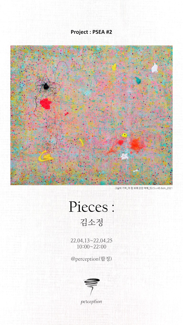 ‘Pieces(조각들)’는 단편적으로 떠올리는 기억의 단위이자 이러한 기억들이 물리적으로 나타난 흔적을 의미한다. 우리가 시각화 시킨다고 상상하는 기억 속의 장면은 시각 뿐만 아닌 감각들의 복합으로 이루어져 있으며, 주관적인 감정의 층위가 덧대어 있다. 작가는 이러한 주관성의 감각을 뚜렷한 윤곽의 형태성보다는 파편화된 질감과 색채로 이루어진 추상적인 화면을 통하여 표현한다. 작품의 표면에는 굳어진 물감의 조각들과 엉킨 실 조각이 ‘시간성’과 ‘흔적’의 오브제로 사용된다. 이는 화면 위에 체화된 감각을 불러일으키는 시각적 촉각성의 실질적 질감과 더불어 시간성을 연상하게 하는 물리적 흔적으로 작동한다.
