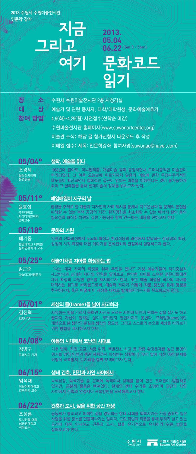 인문학 강좌 『지금 그리고 여기, 문화코드 읽기』는 동시대우리 주변에서 일어나고 있는 사건, 또는 이슈 등에 대한 문화코드를 읽어보고자 기획했습니다.
