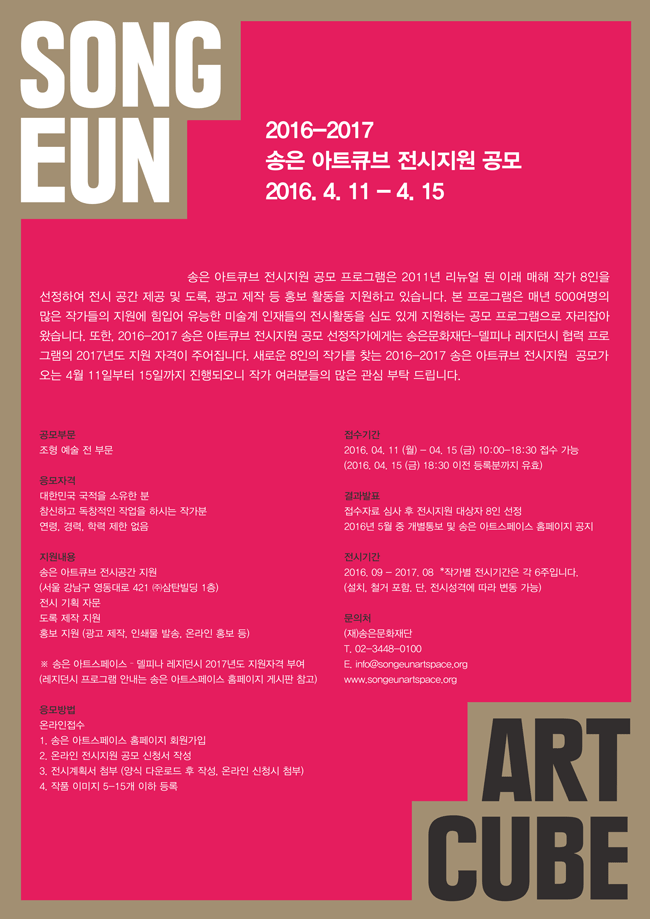 송은 아트큐브 전시지원 공모 프로그램은 2011년 리뉴얼된 이래 매해 작가 8인을 선정하여 전시 공간 제공, 도록 제작 및 홍보 활동을 지원하고 있습니다. 본 프로그램은 매년 500여명의 많은 작가들의 지원에 힘입어 유능한 미술계 인재들의 전시활동을 심도 있게 지원하는 공모 프로그램으로 자리잡아 왔습니다. 또한, 2016-2017 송은 아트큐브 전시지원 공모 선정작가에게는 송은문화재단- 델피나 레지던시 협력 프로그램의 2017년도 지원자격이 주어집니다. 새로운 8인의 작가를 찾는 2016-2017년 송은 아트큐브의 전시지원 공모가 오는 4월11일부터 15일까지 진행되오니 작가 여러분들의 많은 관심 부탁 드립니다.