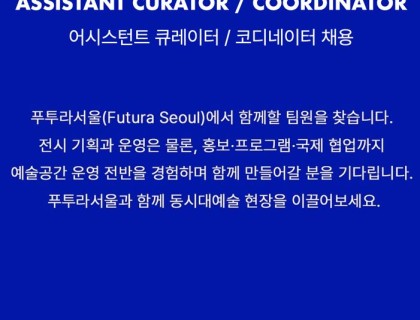 푸투라서울은 북촌의 역사적 맥락 위에 미래지향적 현대미술을 소개하는 공간으로, 국내외 작가 협업 및 실험적인 전시를 기획합니다.푸투라서울에서 어시스턴트 큐레이터/전시 코디네이터를 다음과 같이 모집하고자 합니다. 본 채용은 전시 기획·운영뿐 아니라 예술공간 전반의 다양한…