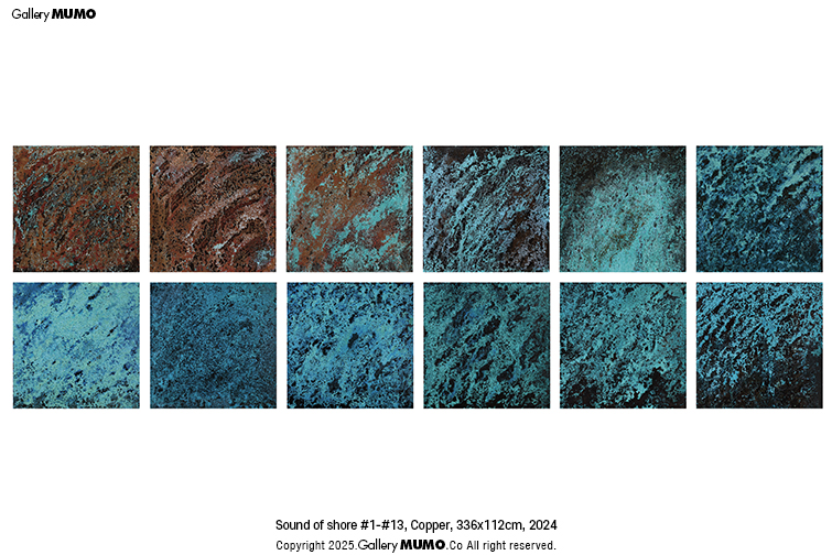 또한 작가의 평면 작품으로의 전환은 자연의 광활함과 장대함을 담아내고자 하는 여망의 또다른 확장으로서 몇십장이 넘는 금속판을 이어 붙여 거대한 하나의 작품을 완성한 것은, 개별적인 작은 조각들이 모여 전체를 이루는 자연의 원리를 다시금 스케일의 확장이라는 형식으로 풀어낸 열정적인 시도이다. <Sunset Wave> 연작은 유화가리 착색 기법을 통해 매번 새로운 텍스쳐와 색감을 보여주며, 포착한 노을의 빛과 색감, 순간의 아름다움을 영원히 기록하며 잡아두려는 열망을 구현하고 있다.