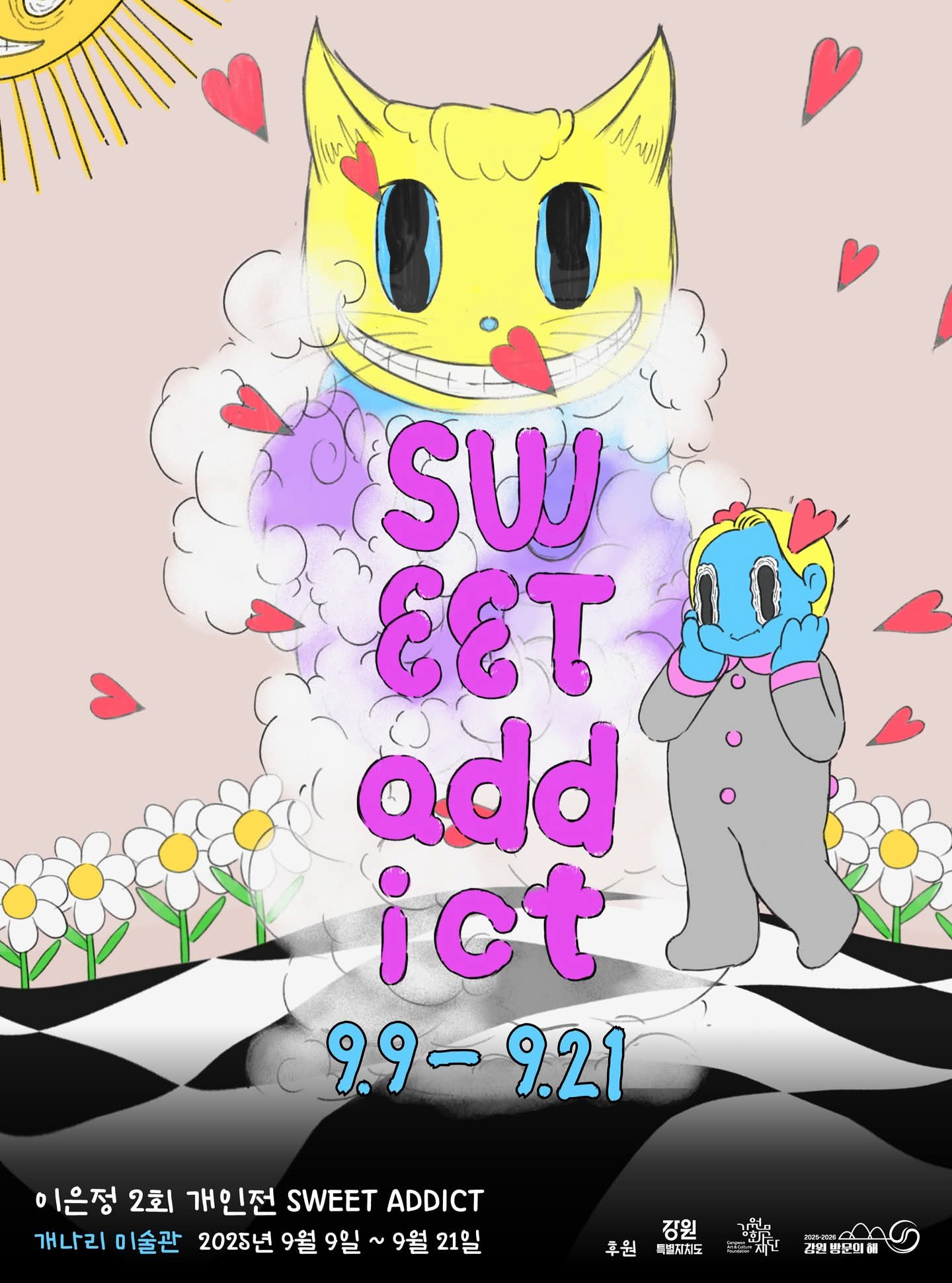 ‘모즈비(MOZBIE)’는 좀비(ZOMBIE)라는 단어를 재배열하여 만든 이름으로, 파랗게 질린 좀비 캐릭터에 내면의 불안을 투영해 독창적인 세계관을 구축하고 있다. 첫 개인전 《UNDEAD or NOTALIVE》(2024)가 모즈비의 존재론적 괴리감을 다룬 서사의 프롤로그였다면, 《Sweet Addict》 전시에서는 모즈비의 불안을 쫓는 여정이 시작된다.