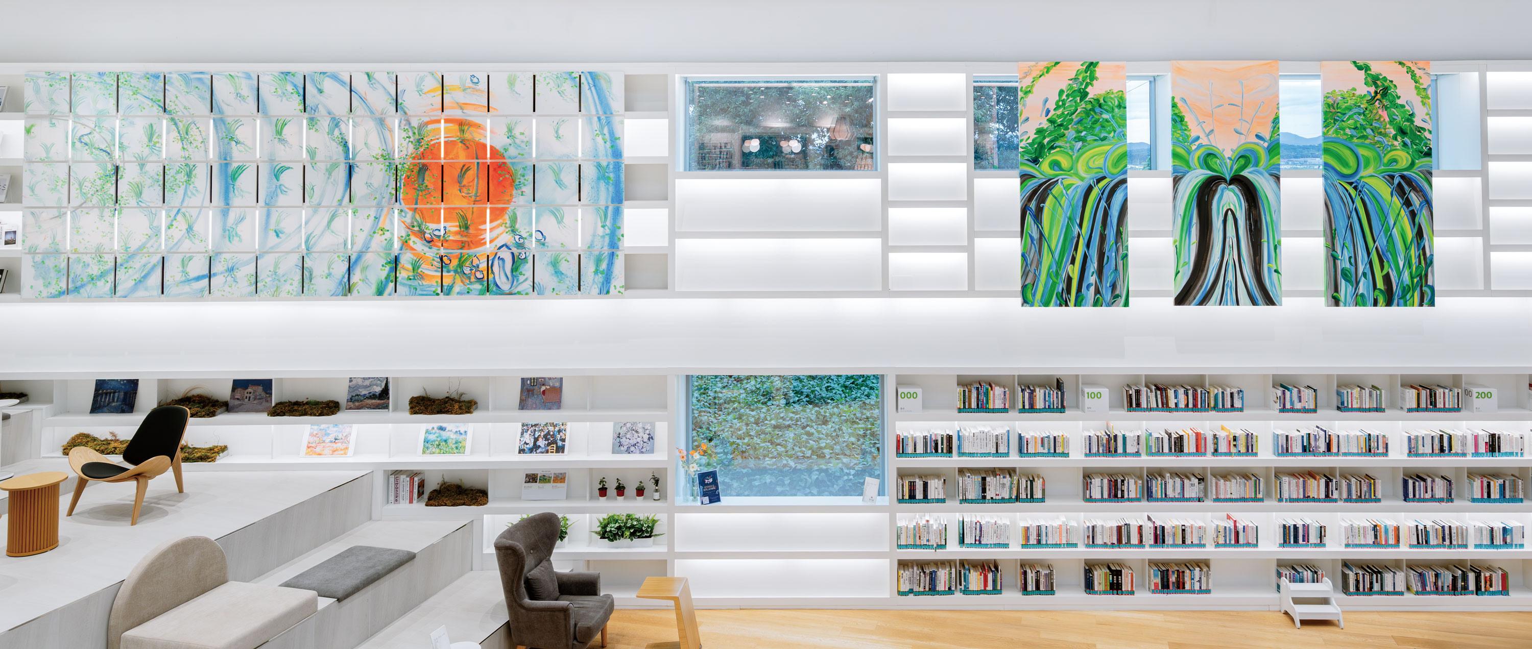 그 아래 초록 플랜트들. 그 공간이 품고 있는 따스함과 섬세함이 참 인상적이었습니다. ‘이 아름다운 도서관을 누가 이렇게 정성스레 가꾸고 있을까?’
