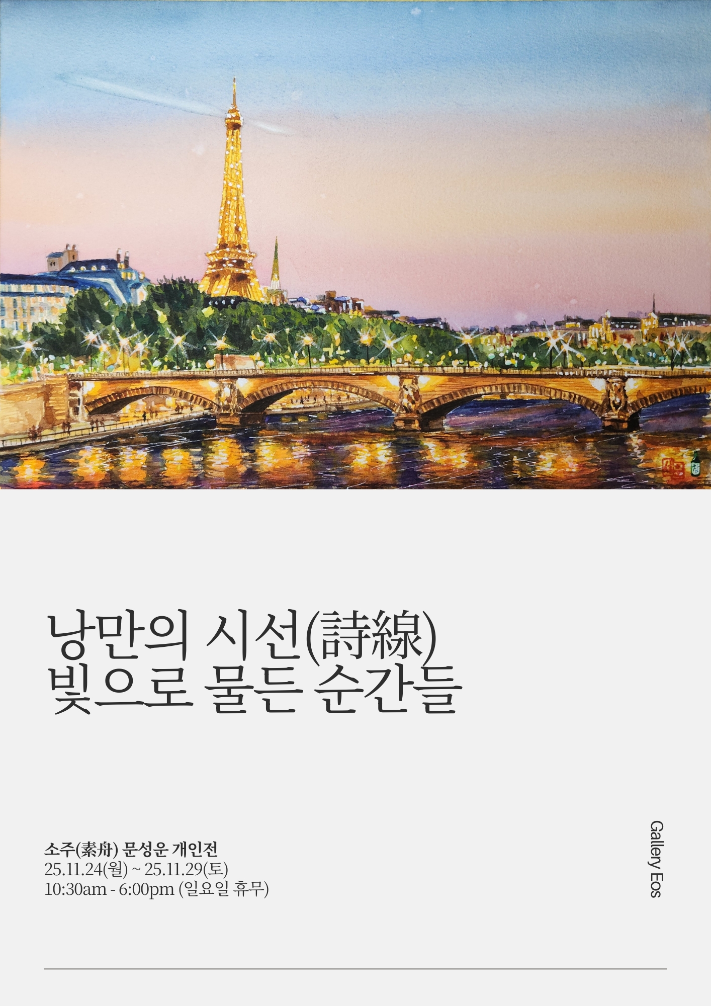 갤러리 EOS는 오는 11월 24일부터 29일까지, 소주(素舟) 문성운 개인전 《낭만의 시선(詩線) 빛으로 물든 순간들》을 개최합니다.