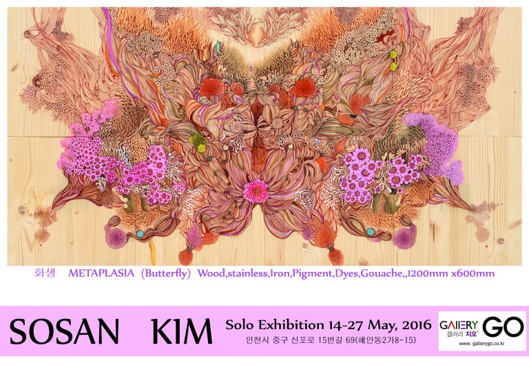 이러한 공간 구성은 이전 작품이 추구했던 수평적 관계 맺기에서 한 걸음 더 나아가 수직적 관계 맺기를 더한다. 이전 시리즈가 나와 나를 둘러싼 세상과의 수평적 관계 맺기였다면 이번 시리즈는 내가 인식하지 못하는 다른 차원의 우주와 내가 살고 있는 세상과의 새로운 관계 맺기를 시도했고 이를 위한 형식적 발현이라고 볼 수 있다. 여기에 재료적 실험이 더해진다. 예를 들어, 김소산의 작품에서 퍼즐을 맞추듯 모두 다른 시공간의 과거를 가진 나무 조각들은 각기 그려지고 하나의 캔버스에서 다시 만나며 하나이지만 하나가 아닌 생명을 발한다. 나무 조각들이 거울을 보듯 마주 보고 같은 형상으로 나타나기도 한 장이 끝나면 다음 장이 기다리고 있는 생의 섭리처럼 오르고 내리기를 반복하기도 한다. 또한, 캔버스 대신 자연의 일부인 나무 위에 인간이 그린 생명의 이미지가 만나 실재하지만 실재하지 않는 경계 없는 생명을 드러낸다. 더 나아가, <셔틀>시리즈에서 시작된 따뜻한 느낌의 나무와 차가운 느낌의 스테인레스스틸을 동시에 사용하는 재료적인 실험은 <스포어스페이스>에서는 스테인레스스틸 뿐만 아니라 알루미늄과 동을 더하는 것으로 확장된다. 또한, <셔틀>에서 나무를 잡아주는 버팀으로 사용되던 금속 재료는 <스포어스페이스>에서 닭, 만다라 등 보다 본격적인 형상으로 등장하거나, 나무 뒤가 아니라 나무 위에 올려지기도 한다. 이 경우, 금속 위에 새겨진 이미지와 에칭에 의해 뚫린 선들 사이로 그 아래에 놓인 나무 위에 그려진 세계를 동시에 보여 줄 수 있게 된다. 나무 역시 겹겹이 쌓여 하나가 된 합판을 쓰고 그 겹들을 드러내기 위해 측면까지 겹겹이 색을 입힌다. 이렇게 다른 차원으로 확장된 관계 맺기는 <스포어 스페이스>의 작가 노트에 등장하는 ‘블랙홀, 화이트홀, 웜홀’이라는 주제어들로도 짐작해 볼 수 있다.