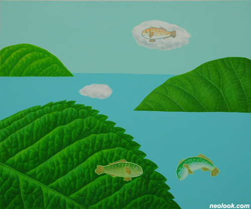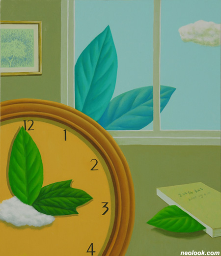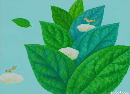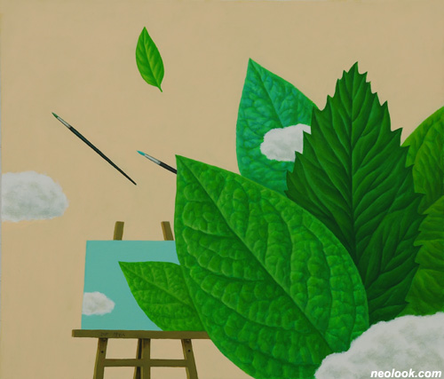 하늘에 목을 내민 나무와 세상으로 비유한 인간의 작은 모티브가 소담하게 어우러진 그의 조형세계는 늘 그렇게 푸르른 잎사귀와 꿈으로 부풀어 오른 구름의 이야기로 전개된다. 자연을 집안 내부로 끌어들여 구름이 요리가 되고 나뭇잎이 다정한 친구가 된다. 하늘을 나는 물고기나 바다 속을 헤엄치는 구름, 산이 되어 나무를 길러내는 잎사귀, 이들은 모두 역발상적인 사고의 자유로운 경계의 해체 또는 융합, 사물의 고정된 관념을 뛰어넘은 발상의 전환을 보여준다. 범우주적인 나무를 향한 본성과 그리움에 천착한 작가가 나무의 변신체인 잎으로의 전환은 필연적인 귀착점으로 보인다. 나뭇잎을 통해 작가는 더 많은 사유의 자유로움을 획득하였을 것이며, 또한 끊임없이 자신의 모습을 반영하며 생각하는 나뭇잎으로의 자신의 모습을 그려나갈 것이다. 전작에 비해 한층 더 일상적인 기물들을 화면에 끌어들임으로써 현실과 환상, 실재와 허구, 지각과 사유, 대상과 공간, 질서와 혼돈이 상큼하고 경쾌하게 결합되어 곳곳에 작가의 빛나는 감성이 녹아있는 화면들로 연출된다. 그리고 그 삶의 모습은 정직하게 현재의 자아의 존재감을 즐거운 상상력으로 풀어내고 있다.