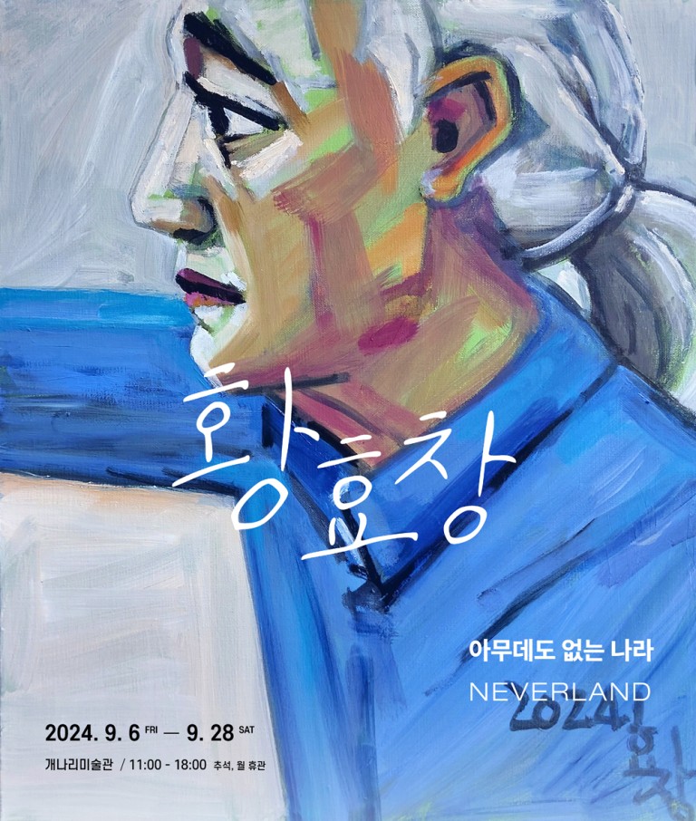 개나리미술관에서는 9월 6일부터 28일까지 황효창작가의 개인전 <아무데도 없는 나라>를 개최한다. 특히 이번 전시는 삶의 황혼기에 서서 지나온 날들을 돌아보는 성격을 지니고 있다. 크게 “춘천”의 산과 물을 배경으로 한 풍속화와 작가의 삶이 스며 있는 “자화상” 두 가지를 주제로 한다. 40점에 가까운 유화 작품들이 전시되며, 신작 10여점을 포함한다.