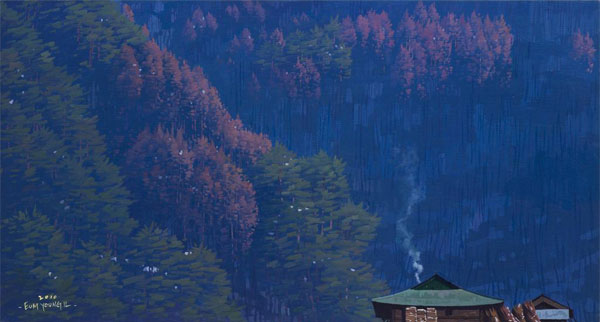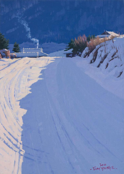굴뚝에서 모락모락 솟아나는 연기와 누군가가 지나다닌 흔적들이 엿보이는 눈길이 표현된 <그리움>이라는 작품에서는 인간의 온기를 느끼기에 충분하다. 그의 예전의 작업에서 보여주었던 자연의 위엄과 경외감이 화폭의 전면을 지배하였다면 최근의 작업들에서는 그 자연 안에서 부대끼며 살아가고 있는 사람들의 정서에 작가의 마음이 쏠려있음을 짐작하게 한다.