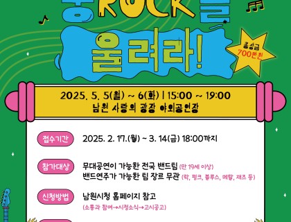 「제95회 춘향제」 테마 “춘향의 소리, 세계를 열다"의 취지에 맞게 전국의 다양한 밴드 팀들을 모집하여 경연을 통해음악적 역량을 겨룰 수 있는 기회를 제공하고자 [전국 밴드 경연대회]를 개최하오니 많은 관심과 참여 바랍니다. 1. 대 회 명: 2025 제95회 남원시 춘향제 전국밴드경연대회 "풍ROCK을 울려라!"2. 대회일시: 2025. 5. 5.(월) ~ 5. 6.(화) 15시 ~ 19시3. 장 소: 남원 사랑의 광장 야외공연장4. 참가대상가. 무대공연이 가능한 전국 밴드팀…