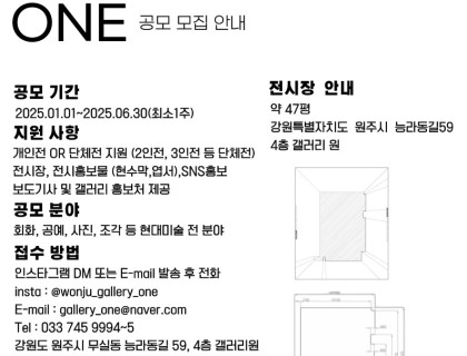 갤러리 원(GALLERY ONE)에서 2025년 상반기 공모전 모집을 진행 하오니창의적이고 열정 넘치는 작가님들의 많은 관심과 참여 부탁드립니다.■ 개 요대 상 : 전연령공모분야 : 회화 공예 사진 조각 등 현대미술 전 분야전시공모기간 : 2025년 1월 1일~2025년 6월 30일(최소 1주)접수마감 : 선정 완료 시 조기 마감■ 지원방법1) 인스타그램 DM 또는 E-mail 발송 후 전화insta : @wonju_gallery_oneE-mail : gallery_one@n…