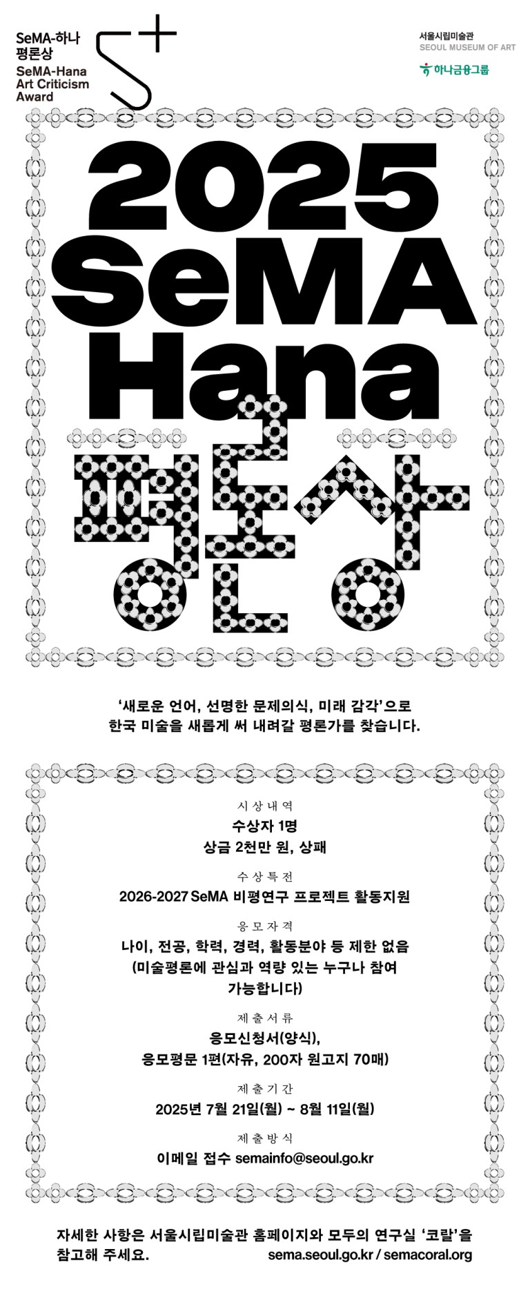 서울시립미술관은 2025 〈SeMA-하나 평론상〉을 공모하며, ‘새로운 언어, 선명한 문제의식, 미래 감각’으로 한국 미술을 새롭게 써 내려갈 평론가를 찾습니다. 〈SeMA-하나 평론상〉은 일체 자격 제한 없이 응모 평문 심사를 통해 수상자를 선정하는 ‘열린 공모상’입니다. 2025 〈SeMA-하나 평론상〉의 수상자는 2천만 원의 상금에 덧붙여, 미술관과 함께 평론의 반경과 깊이를 키워갈 2026-2027 〈SeMA 비평연구 프로젝트〉 참여 기회를 얻습니다. 새로운 시선과 통찰로 시대와 미술을 읽어낼 이들의 적극적인 참여를 기다립니다.