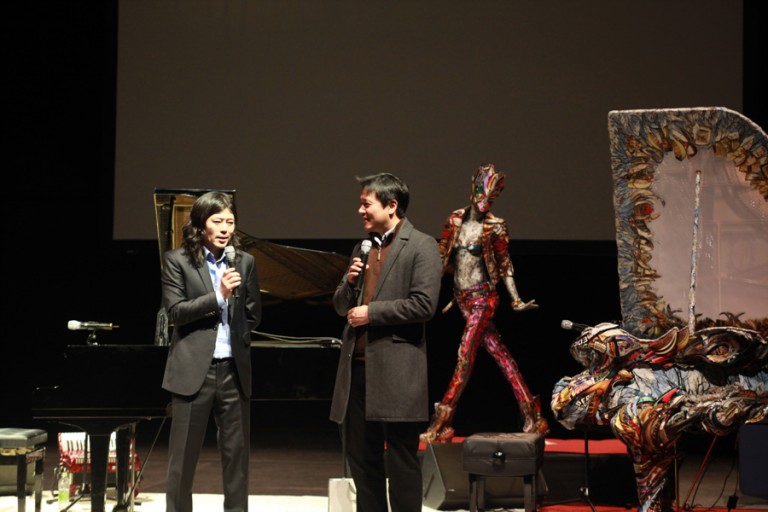 <국립극장의 피아노와 이빨 공연에서 작품설명을 하고 있는 피아니스트 윤효간과 미술가 장승효>