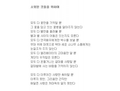 그는 내게 미소가 되라 하지만그러나 아직 내 안에 큰 울음이 넘쳐난다그는 내게 아무것도 아닌 것이 되라 하나나는 그럴 수 없다 한다 화상아자르