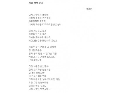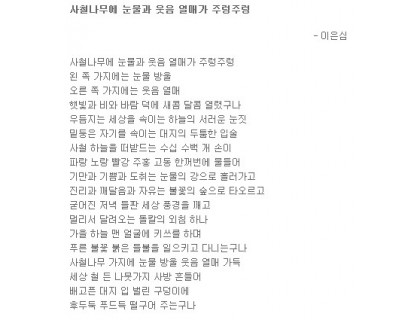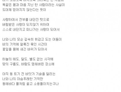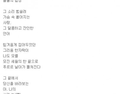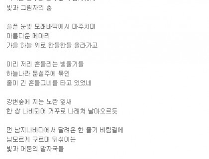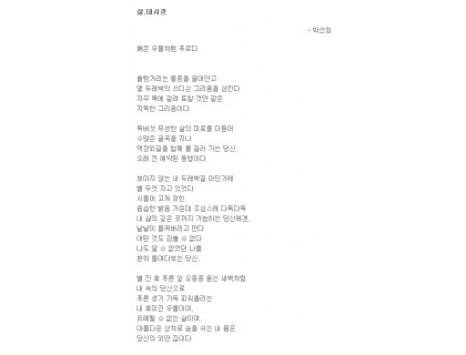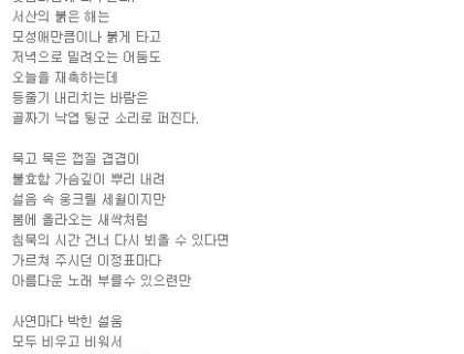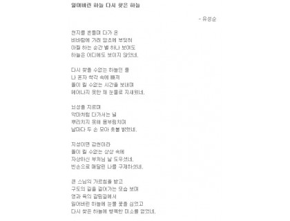 제목: 사랑이여 가세나 첩첩 산중의 길을 가세나하늘도 보이지 않는 우거진 잔 솔 가지 베어 내고 바위 산 넘어 꺼질 줄 모르고 타오르는 갈망의 길을 가세나참을 수 없는 본능의 꿈틀 거림으로 외쳐대는긴 긴 날들의 사르고 살랐던 사랑이여여기가 어디던가동면의 잠에서 깨어난 개구리의 첫 마디인가세상 구경하겠다고 사랑 한번 하겠다고긴 긴 날들 살라왔던 골 깊은 기다림도 찬란한 네온 싸인 밤거리에 골목 골목 빨간 등 밝히고 창자 속 토사물 가정 기워 내라 유혹하는 세상 앞에 우물안의 하늘…