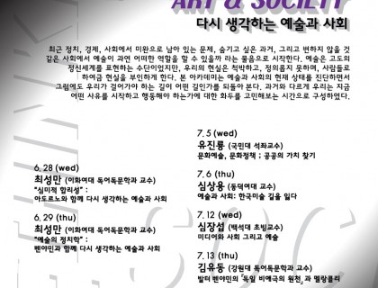 ▶날짜: 6월 28일, 29일, 7월 5일, 6일, 12일, 13일, 19일▶시간: 오후 3시 – 5시▶장소: 아트스페이스 와트 (서울시 종로구 명륜2가 96 2층)▶대상: 예술관련 종사자, 전문가, 일반인, 학생▶참가비: 무료▶신청 방법: 사전 E-mail 접수 (projectmap00@gmail.com)▶후원: 한국문화예술위원회, 한국메세나협회, 호텔베르누이웨딩▶협력: 아트스페이스와트 □ 강의 소개 ▶6. 28 (wed)최성만 (이화여대 …