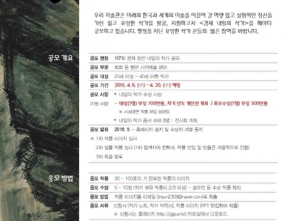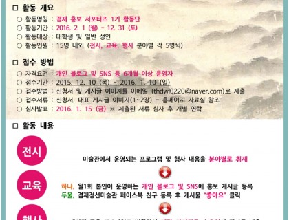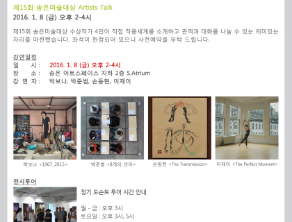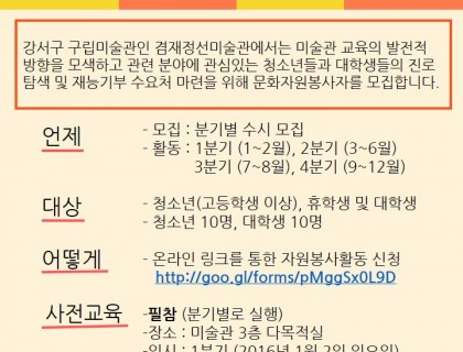 송은 아트스페이스에서 ‘제15회 송은미술대상전’ 도슨트 자원봉사자를 모집합니다. 송은미술대상은 2001년에 제정된 상으로 지난 10여 년간 한국의 재능 있는 젊은 미술작가들을 육성하기 위해 매년 공정한 심사를 통해 우수한 수상자를 배출해 왔습니다. 2011년부터 새롭게 재정비되어 대상후보 최종 4인의 그룹전을 통한 심사방식이 추가되었고, 수상작가로 11회 한경우(대상), 장선경, 정희승, 이원호(우수상), 12회 최선(대상), 백정기, 윤보현, 하태범(우수상), 13회 박혜수(대…