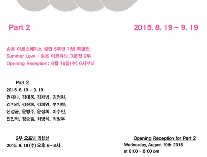 Summer Love : 송은 아트큐브 그룹전전시기간1부 : 2015. 7. 10 (금) – 8. 8 (토) 참여작가 :강호연, 고석민, 김수희, 김승구, 박문희, 박미경, 박지혜, 박형렬, 박혜민, 백승민, 설 박, 송수영, 이건영, 정지현, 최성임, 한경원 (16인)2부 : 2015. 8. 19 (수) – 9. 19 (토) 참여작가 :권재나, 김대웅, 김재범, 김정현, 김지선, 김진희, 김희영, 부지현,신정균, 윤병주, 윤정희, 이수인, 전민혁…