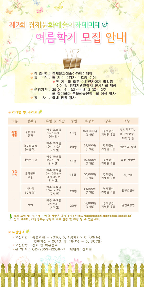 [겸재정선기념관] 제2회겸재문화예술아카데미대학 여름학기모집안내 페이지 정보 작성자 장희선 조회 16,040회 작성일 10-05-14 16:00 본문 많은 관심과 참여 부탁드립니다. 추천 0 목록 이전글 꿈의 대화: 『Vale Tudo』展 11.01.02 다음글 합리성과 투명성으로 무장한 온라인 미술시장이 뜬다 10.02.22 장희선님의 자유게시판 관련글 자유게시판 더보기 H 인기글 [겸재정선미술관] 2018. 제9회 겸재 내일의 작가 … 07-07 H 인기글 [겸재정선미술관] 2017. 겸재랑 즐거운 어린이날 대… 04-16 H 인기글 [겸재정선미술관] 제14회 겸재 전국 사생대회 04-16 H 인기글 [겸재정선미술관] 2017. 제8회 겸재 학술논문현상공… 12-27 H 인기글 [겸재정선미술관] 2017. 제8회 겸재 내일의 작가 … 12-27 H 인기글 [겸재정선미술관] 2017. 겸재 미술관 극장 안내 12-21 H 인기글 [겸재정선미술관] 2017. 겸재 함께 공부하기 강좌 … 12-21 H 인기글 [겸재정선미술관] 2017. 명사석학 미술 인문학 강좌… 12-21 H 인기글 [겸재정선미술관] 제2기 겸재 홍보 서포터즈 활동단 모… 12-06 H 인기글 [겸재정선미술관] 2017. 학술논문현상공모 안내 08-02