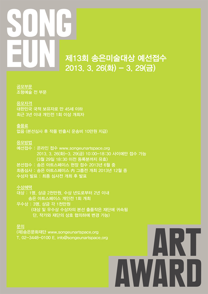 (기존 송은미술대상 수상작가의 경우, 수상으로부터 3년 이후 재응모 가능)