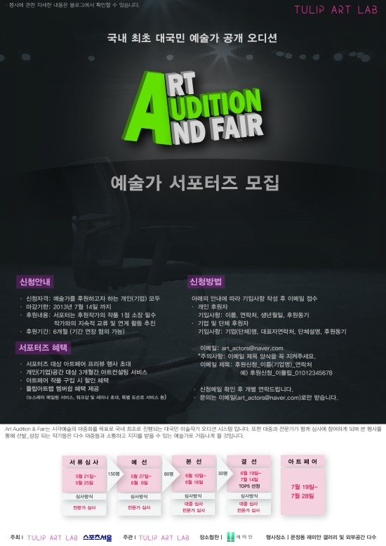 이번 "Art Audition & Fair 2013" 시즌 1은 (스포츠서울과 튤립아트랩이 공동주최) 시각예술의 대중화를 목표로 국내 최초로 진행되는 대국민 미술작가 오디션 시스템 입니다. 또한 대중과 전문가가 함께 심사에 참여하게 되며 본 행사를 통해 선발_성장 되는 작가들은 다수 대중들과 소통하고 지지를 받을 수 있는 예술가로 거듭나게 될 것입니다.