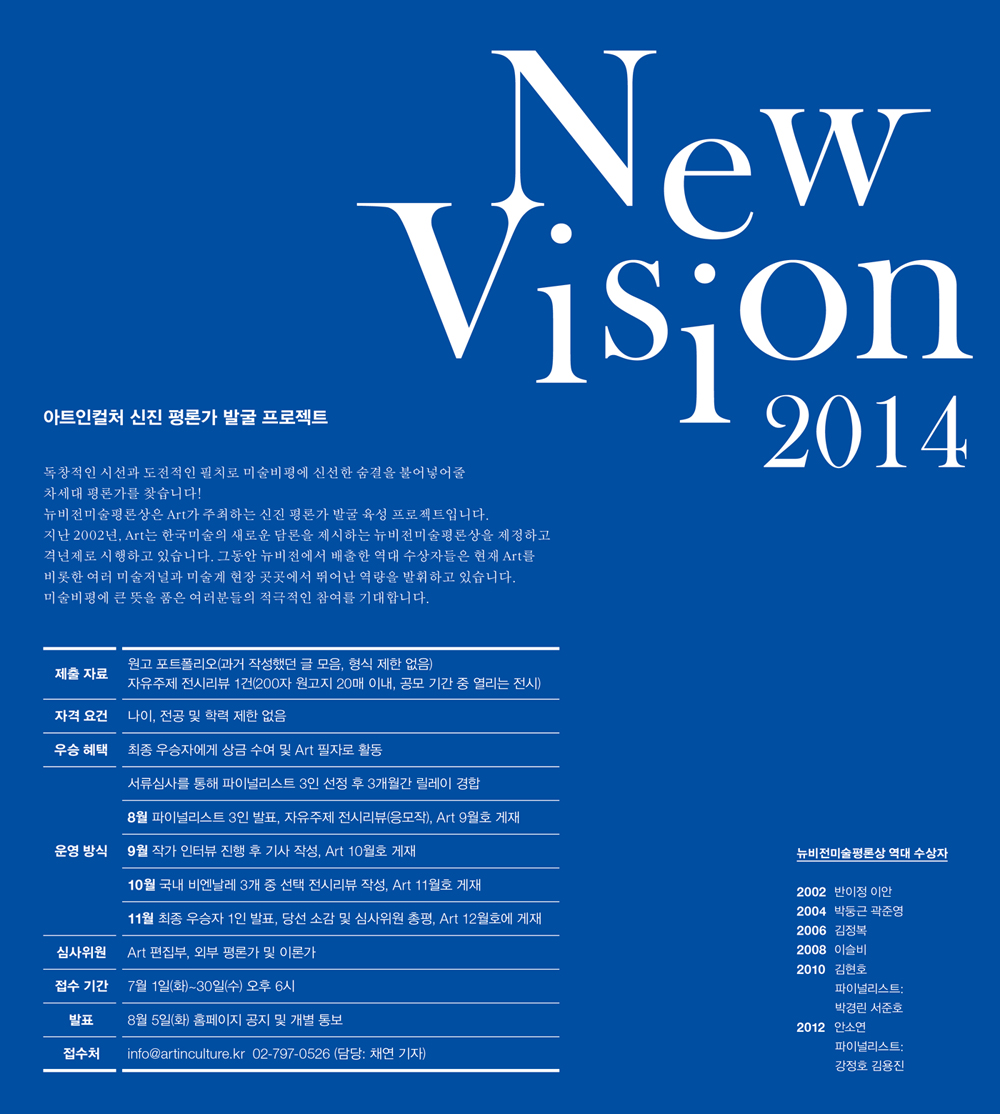 지난 2002년, Art는 한국미술의 새로운 담론을 제시하는 뉴비전미술평론상을 제정하고 격년제로 시행하고 있습니다. 그동안 뉴비전에서 배출한 역대 수상자들은 현재 Art를 비롯한 여러 미술저널과 미술계 현장 곳곳에서 뛰어난 역량을 발휘하고 있습니다. 미술비평에 큰 뜻을 품은 여러분들의 적극적인 참여를 기대합니다.